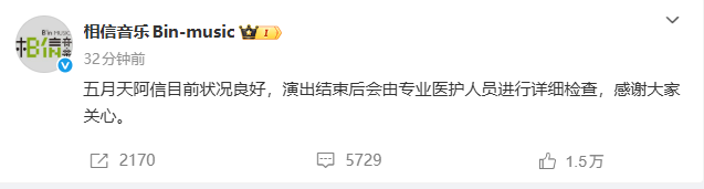 随后,@相信音乐Bin-music 发文: 五月天阿信目前状况良好,演出结束后会由专业医护人员进行详细检查,感谢大家关心。