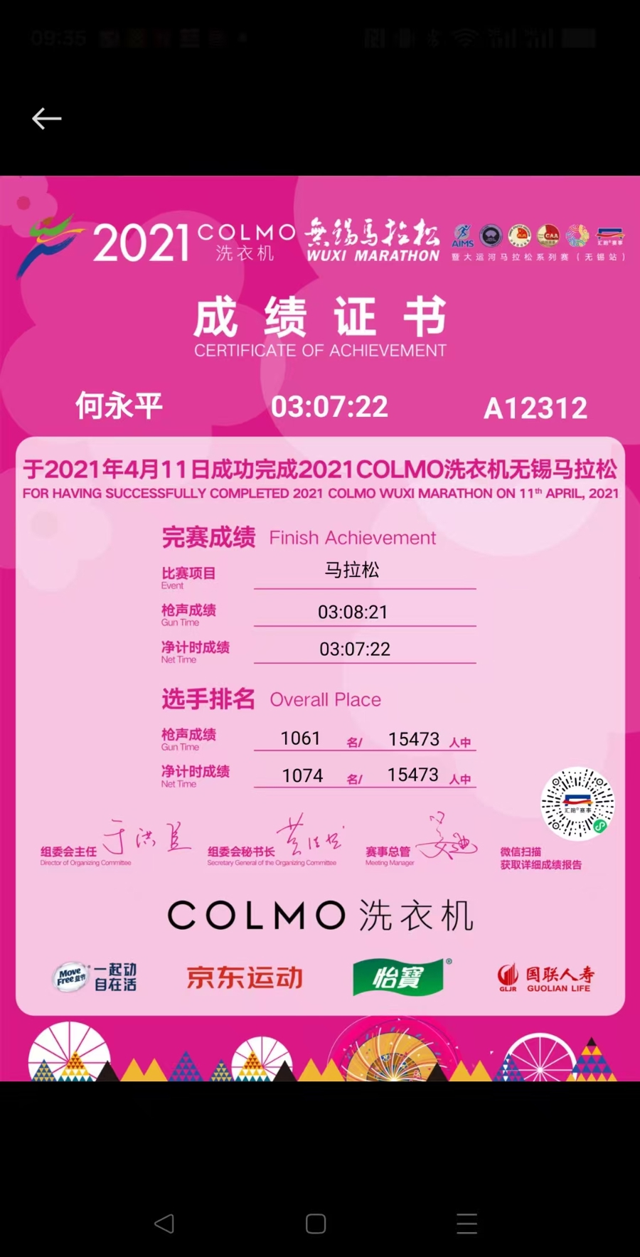 除了大满贯赛事,何永平还参加过北京、武汉、杭州、深圳等马拉松赛事。目前他全马最好成绩是 2021 年无锡马拉松的 3 小时 7 分 22 秒;半程马拉松为 2024 年扬州半马的 1 小时 22 分 14 秒。从 2016 年到今年,他跑步总里程超过 2.5 万公里。