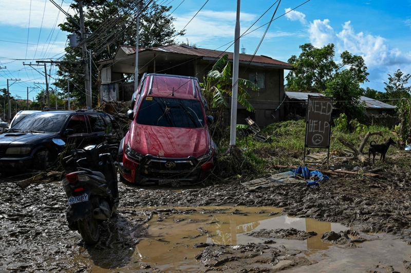 这是11月6日在菲律宾宿务省利洛安拍摄的在台风中受损的汽车和寻求帮助的标语牌。