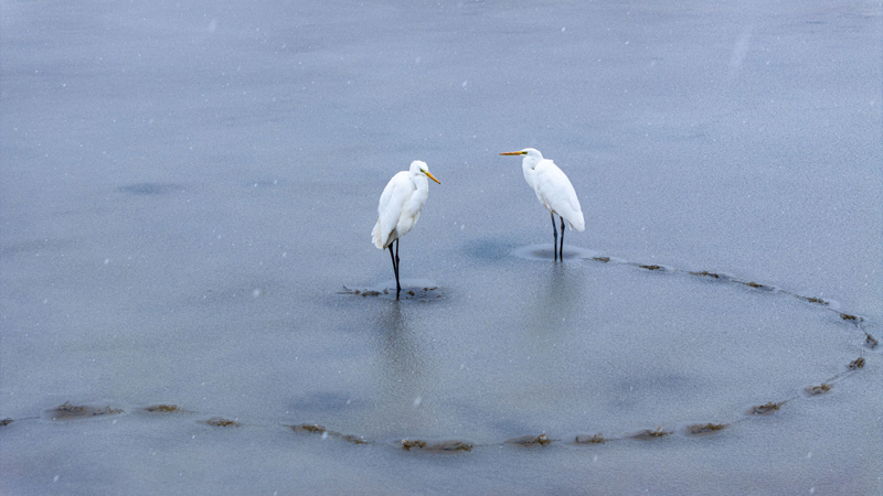 11月6日,在新疆木垒县守静园,两只白鹭站在雪中(无人机照片)。