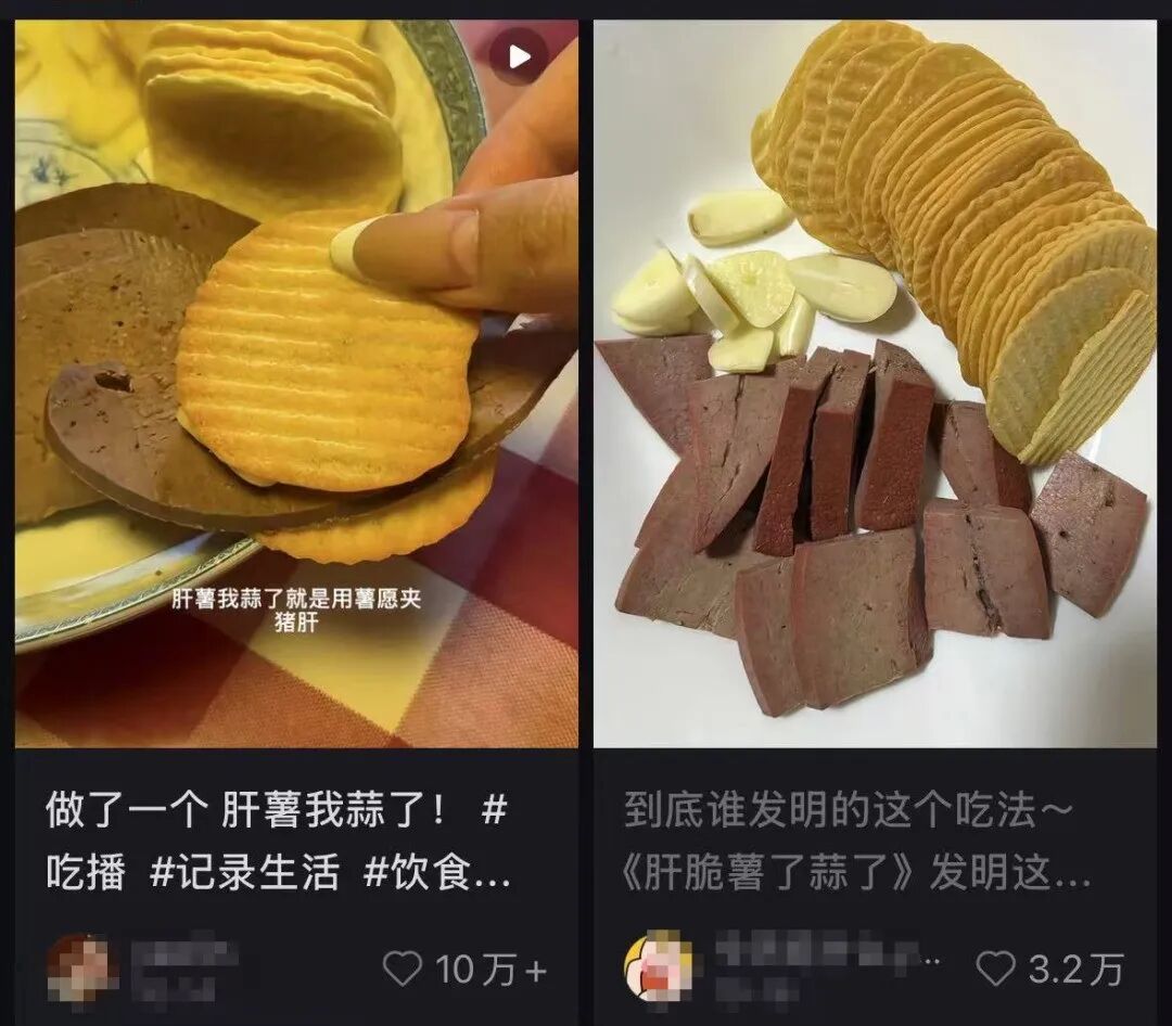 除了谐音梗,大家对这种新奇的吃法也存在猎奇心理。猪肝、薯片和蒜片,无论是口感还是风味都具有强烈的反差,猪肝的醇厚、薯片的酥脆、大蒜的辛辣,形成了一种复杂的味觉体验。