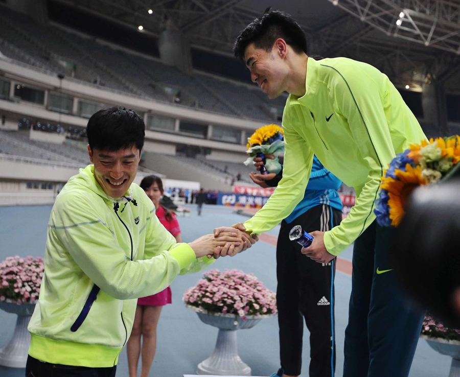2014年钻石联赛上海站,刘翔为谢文骏颁奖